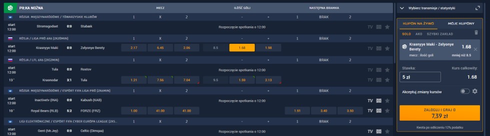 Jeżeli chodzi o sporty wirtualne to STS oferuje jedynie piłkę nożną, koszykówkę oraz tenis. Brakuje w ofercie wyścigów psów, koni czy kolarstwa. Podczas obstawiania można również oglądać konkretne rozgrywki. Jakość obrazu jest na przyzwoitym poziomie, ale np. w porównaniu do Fortuny jest niska. Na plus w przypadku sportów wirtualnych zasługuje jednak bardzo szeroka oferta zdarzeń i dostęp do bardzo rozbudowanych statystyk, które dotyczą konkretnych sportów.